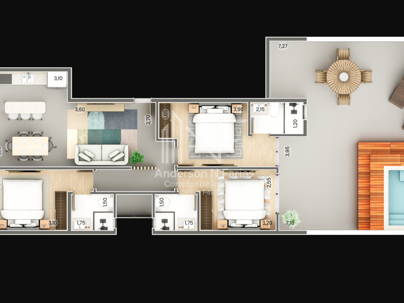 Com 168,42 m² de área total, sendo 112,53 m² de área privativa, este imóvel foi cuidadosamente planejado para proporcionar amplitude, conforto e privacidade. São 3 dormitórios, todos suítes, ideais para acomodar a família com elegância ou receber convidados com total conforto.