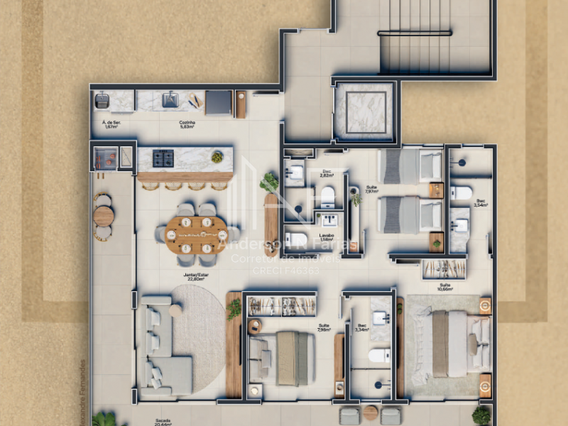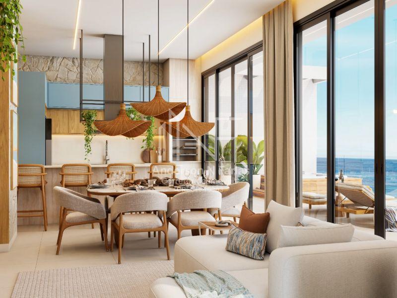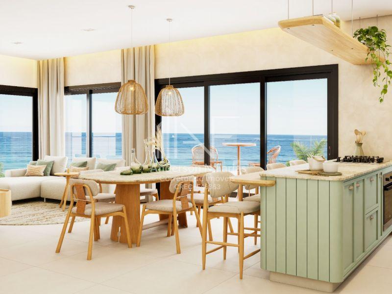 São 147,06m² de área total, com 3 dormitórios (2 suítes), churrasqueira e uma sacada com vista para o mar.