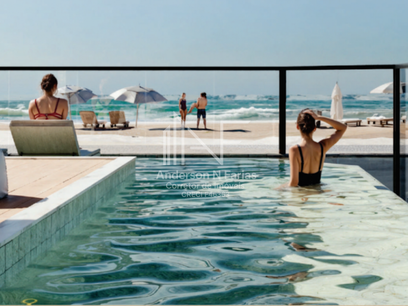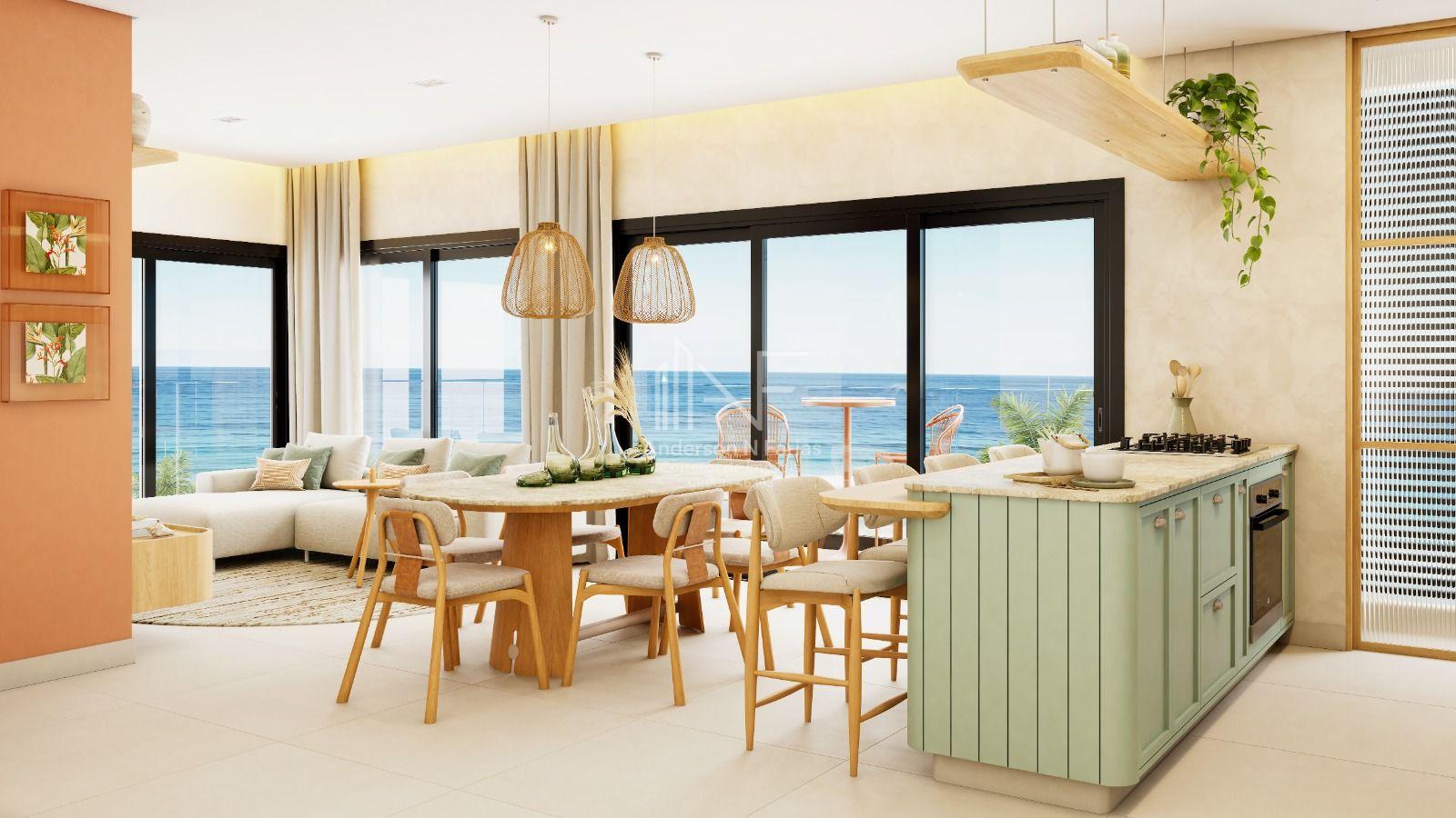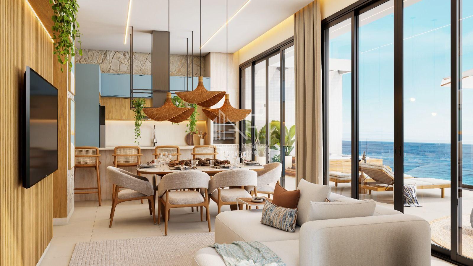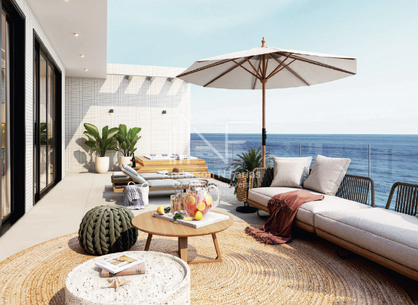 São 134m² de área total, com 3 dormitórios (2 suítes), churrasqueira e uma sacada com vista para o mar.