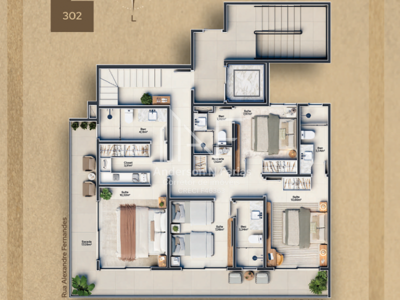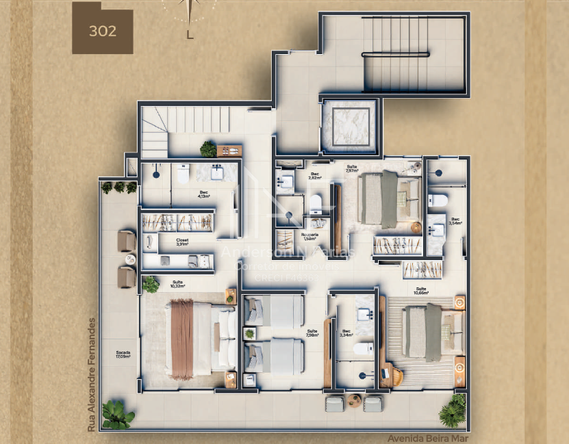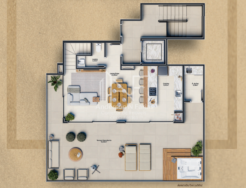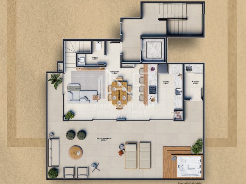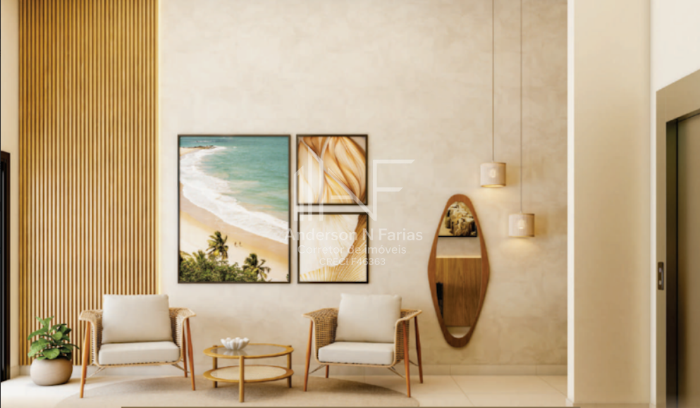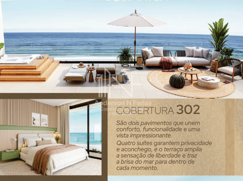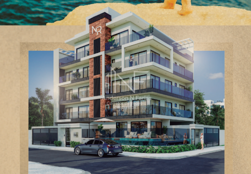 São 134m² de área total, com 3 dormitórios (2 suítes), churrasqueira e uma sacada com vista para o mar.