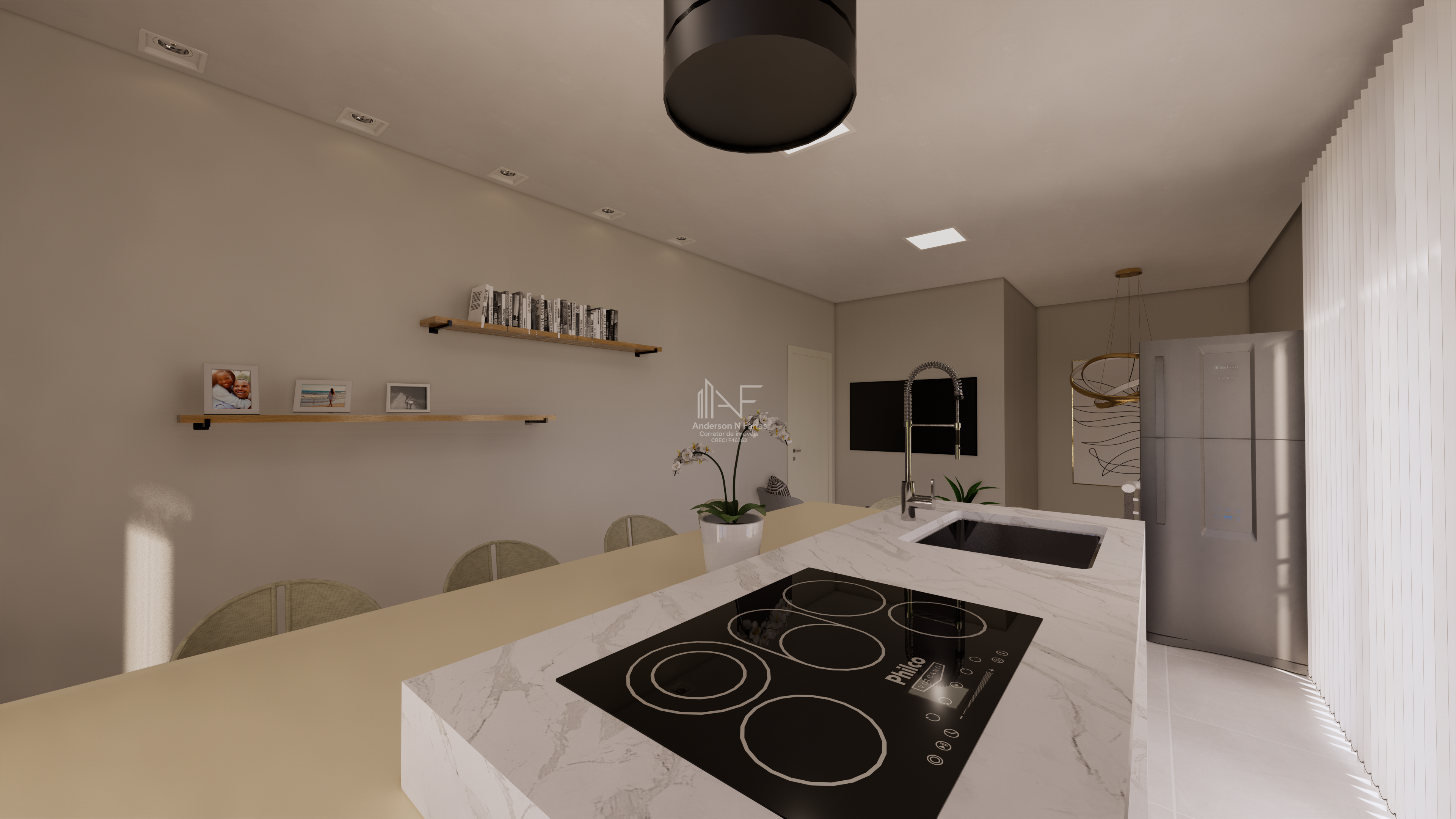 • Sala de TV e cozinha integradas, criando um ambiente moderno e sofisticado